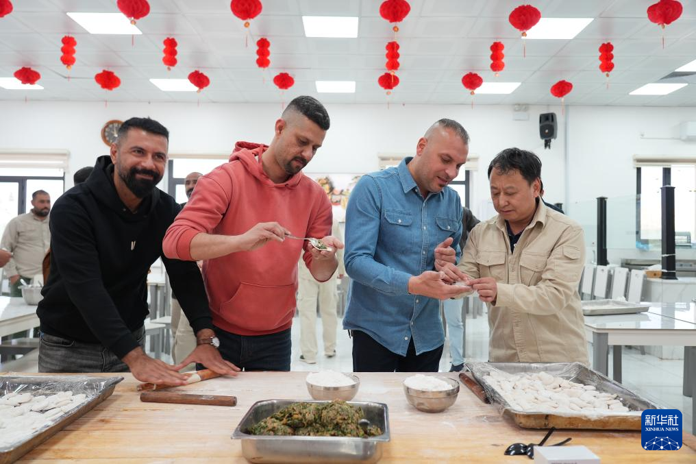 2月16日,在伊拉克瓦西特省Afdeb油田,一名中方员工(右一)正在教伊拉克员工包饺子。农历新年来临之际,油田运营商中国绿洲石油公司在伊拉克战后首个海外能源合作项目阿夫德布油田举办了足球比赛和拔河比赛。中伊两国员工共同包饺子、写“福”字、贴春联,喜迎新春。新华社记者 段明富 供图