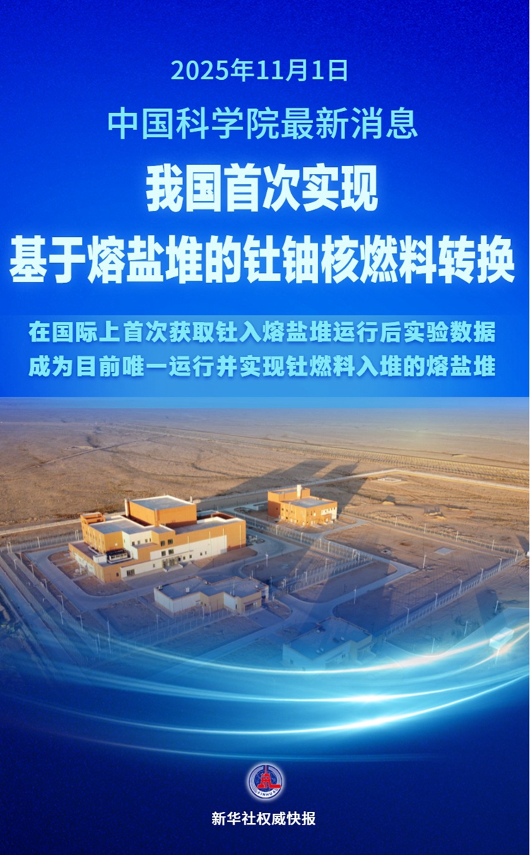 11月1日,记者通过中科院信息获悉,中科院上海应用物理研究所运行的2兆瓦液体燃料钍基熔盐实验堆首次成功转化钍铀核燃料。我们在世界上首次获得了钍在熔盐反应堆中运行后的实验数据。该反应堆是目前运行中唯一内部使用钍燃料的熔盐反应堆。这首次证明了利用钍资源的熔盐堆核能系统的技术可行性,巩固甚至进一步巩固了我国在国际熔盐堆研究领域的领先地位。这是一个重要的里程碑在钍基熔盐堆的研发过程中,为我国未来大规模钍资源的开发利用和第四代先进核能系统的发展提供核心技术支撑和可行的解决方案。记者:胡哲、张建松 海报制作:胡哲、新华社内部制作