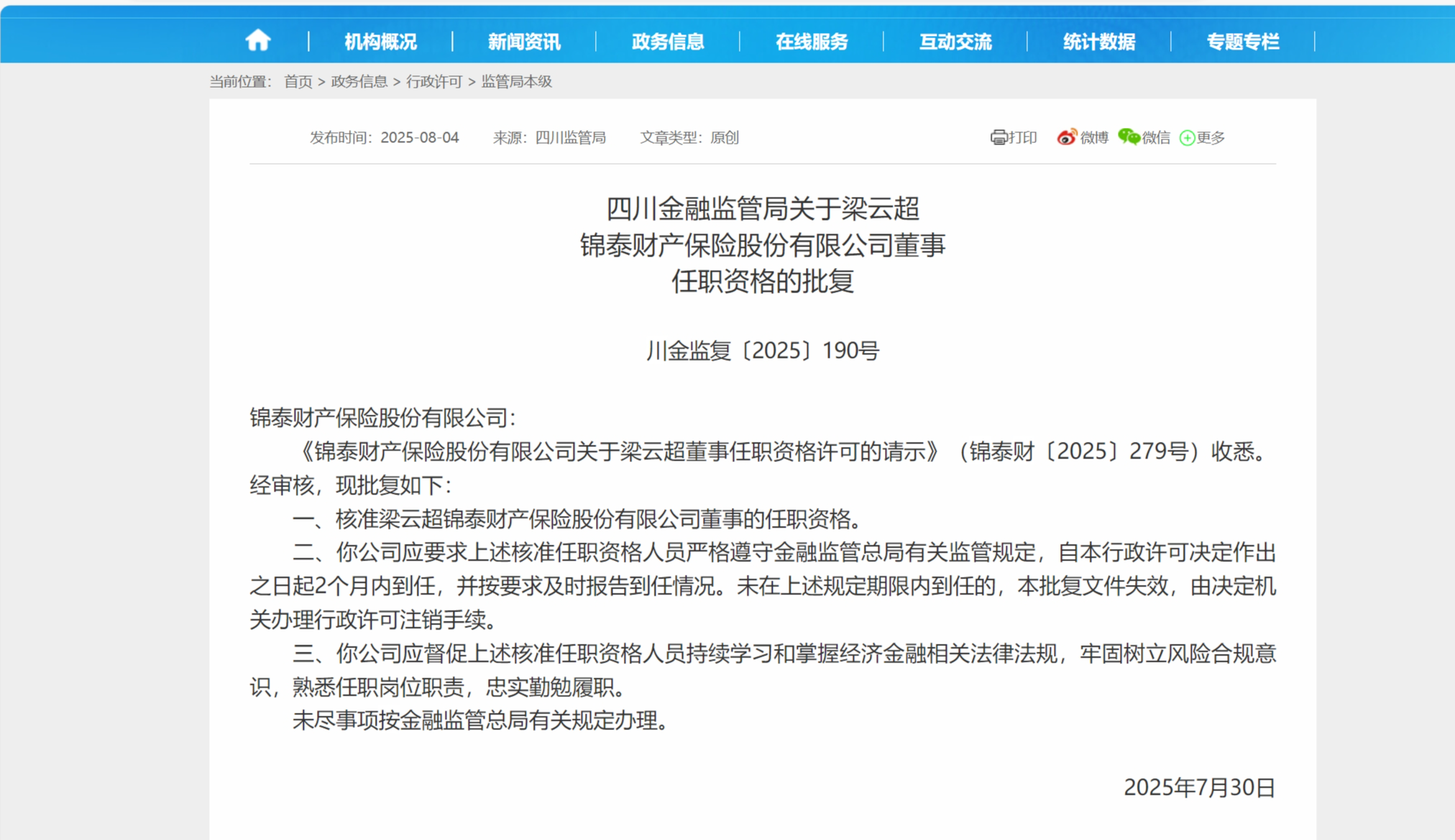 8月4日,四川金融监管局发布了“认可Liang Yunchao Jintai Property Insurance Co.,Ltd。的董事资格”。 (Chuanjinjianfu [2025] No. 190),Liang Yunchao Jininty Property Insurance Co.,Ltd。批准董事的资格。