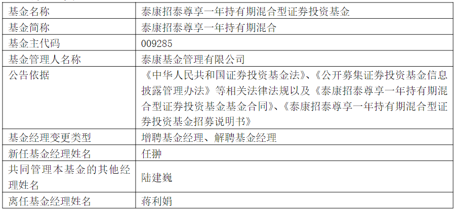 9月3日,Taikang Fund Management Co.,Ltd。中国经济网络北京今天宣布,Taikang Zhaotai享受了一年的混合招聘,而Jiang Lijuan已接任。 Ren Chong于2015年7月参加了Taikang的公开报价,目前是Taikang Fund的债券基金经理。他曾在中国银行金融市场部的投资经理以及债券不稳定基金的总经理助理兼欧安赫林会计师事务所担任高级审计师。自2024年2月28日以来,它一直是Taikang Yuexiang 90天持有债券证券投资基金的基金经理。自2024年8月1日以来,他一直担任60天的债券证券投资基金会的基金经理。自2025年9月1日以来,它一直是Taikang Zhaotai一年的独家Stutch Securities Investment Investment Fund。 Jiang Lijuan于2008年7月加入Taikang Aset,担任集中式贸易室的商人,并担任债券部门的债券经理。 2014年11月,他加入了Taycan的公开报价,担任公共报价部门的债券基金经理和债券投资负责人。他目前是Taycan Fund的债券投资部门和债券基金管理员的负责人。 Taikang Zhaotai于2020年5月20日享有保留期。截至2025年9月2日,今年的收益率为1.61%和1.40%,收益率为15.90%和14.08%,累计净值为1,1590 Yuan和1,1408 Yuan。